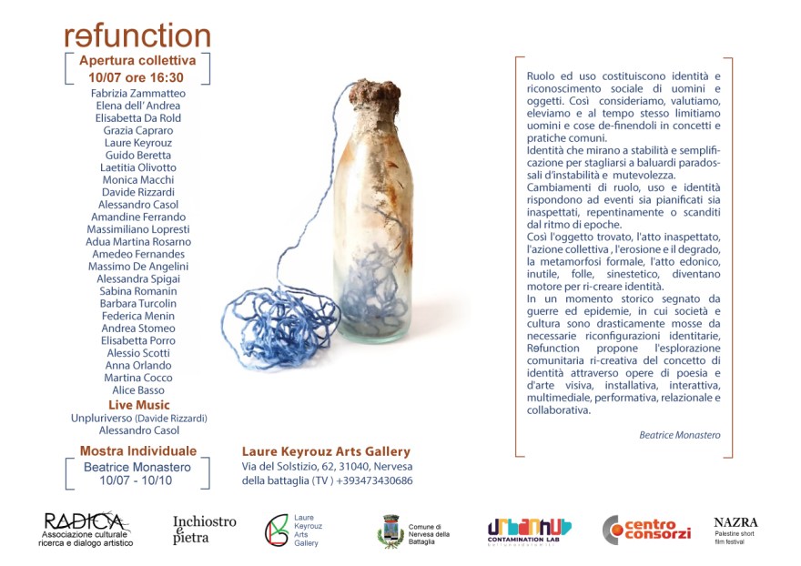 Così l’oggetto trovato, l’atto inaspettato, l’azione collettiva , l’erosione e il degrado, la metamorfosi formale, l’atto edonico, inutile, folle, sinestetico, diventano motore per ri-creare identità. In un momento storico segnato da guerre ed epidemie, in cui società e cultura sono drasticamente mosse da necessarie riconfigurazioni identitarie, Rɘfunction propone l’esplorazione comunitaria ri-creativa del concetto di identità attraverso opere di poesia e d’arte visiva, installativa, interattiva, multimediale, performativa, relazionale e collaborativa.