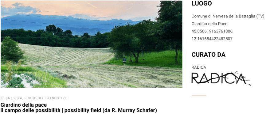 Nasce il “Giardino della Pace – Possibility Field“, uno spazio nato con l’obiettivo di coniugare la natura e la storia attraverso l’ascolto, parte dell’iniziativa “Luoghi del Bensentire“, che mira a valorizzare spazi di particolare interesse acustico. Questi luoghi sono curati con l’obiettivo di preservarne e studiarne le caratteristiche sonore, offrendo anche opportunità per eventi e manifestazioni legati all’udito.