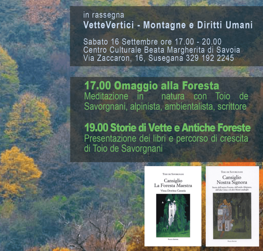 “Sono ormai vicino ai 70 anni e, me ne sto prendendo conto ora, tutta la mia vista è stata un cammino di ricerca e di lezioni ricevute. Ho cercato risposte nella montagna, nell’attività politica e quella ambientalistica. Ma negli anni si è fatta sempre più forte la connessione con il mondo spirituale e dell’invisibile, soprattutto tentando di capire la lezione delle culture native. La Terra e’ viva, cosciente ed agente, la Natura è viva, l’Universo è vivo. Questo è mio punto di partenza che provo a condividere con gli altri.” Toio de Savorgnani