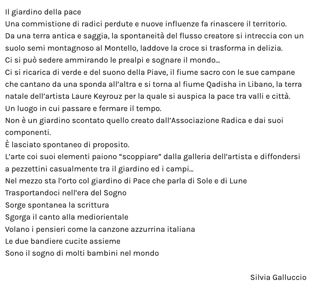 Da lontano si sente il Piave che nel 1918 mormorava “non passa lo straniero”. Era la canzone di E.A. Mario che accompagnò molti ragazzi verso la morte: lo ricordano alcune volte al giorno le campane della chiesetta. Qui, a Sante Croce del Montello, si sente anche la vita tra la vita del bosco, la sera d’estate si sente cucù cucù: è il cuculo, chip chip canticchiano gli altri uccelli, Il ddddd è il picchio che batte l’albero come un tamburo, fri fri è il vento tra le foglie e l’erba, le cicale fanno zzzz, le farfalle, ronzano le api tra i fiori, fri fri friniscono le cicale, piano piano, silenziosi silenziosi, saltano due caprioli. Furtive e silenti passano le volpi cacciatrici, preoccupate di arrivare alle loro prede prima che le portino loro via, piombando dal cielo, le poiane predatrici. Quando si avvicina la migrazione, le rondini, aspettando di partire, suonano musica elettrica sui fili della corrente. Il vento trasporta tutti questi suoni e fa suonare foglie e rami e si sente molto altro, come il nostro cuore, grazie a cui la Piave ritrova il suo melodioso suono; la Piave che prima rifletteva il fischio delle pallottole, del rombo del cannone e delle urla dei morti straziati della prima guerra mondiale. Se si lascia la cosiddetta civiltà e si torna là, nel buio della notte la musica della natura ci parlerà. A volte con il bel sole i bambini grandi e piccini strillano gioiosi nei prati e sentieri circostanti… o voci risuonano come lontani sospiri dalle grotte lungo il fiume, vecchi bunker di guerra. La montagna scherzosa diventa un pappagallo che con l’eco gli risponde. Tutto ciò avviene in un umile praticello dove l’erba e i fiori non hanno mai tremato di paura per il passaggio degli aratori e il bosco senza alberi è divenuto un bel vigneto: il giardino della pace, un’oasi di serenità. E come ci ricorda R. Murray Schafer, padre dell’eco-acustica: