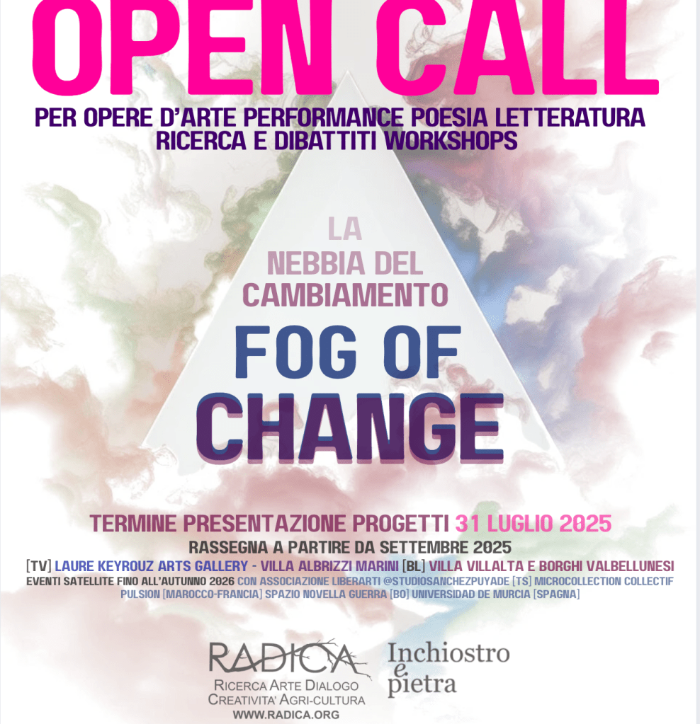 La rassegna culturale “Fog of Change” intende esplorare il concetto di cambiamento e gli stati di incertezza, paura e speranza che accompagnano ambiti diversi della nostra vita. Invitiamo artisti, letterati, ricercatori, performers, folli, disadattati, naufraghi e disertori del mercato d’arte…chiunque AMI condividere espressione e dialogo, a COMPILARE QUESTO FORM entro e non oltre il 29 Agosto 2025 per presentare proposta di partecipazione alla prossima rassegna culturale di RADICA e Inchiostro e pietra.
