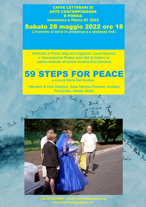 Conosco Irina dal 2013, l’anno seguente l’ho accompagnata in giro per Venezia con il marito Hiram Levy. Ricordo che era impegnata nel suo progetto sul numero 59 ed in quel periodo stava percorrendo nelle maggiori città 59 km disegnando il n. 59 nel percorso e visualizzandolo su Google maps. Prima di partire mi chiese quale ponte di Venezia potesse avere 59 gradini. Inoltre mi scrisse un messaggio premonitore: Il ponte di Rialto era stato terminato nel 1591 una data che contiene il numero 59. Nel 2020 dopo la prima ondata pandemica mi trovavo a girare un breve video contando i 59 gradini proprio del Ponte di Rialto e ad entrare nel progetto di Irina 59 steps tour Rialto Bridge a supporto dell’Ucraina, che trova dialogo con il mio lavoro Venezia e i suoi Ponti, proseguito con altre città di Ponti tra cui San Pietroburgo e Pittsburgh, che fanno da sfondo a questa serata. Questo interessante dialogo tra USA, Russia e Ucraina emerge in 59 Brides di Irina, metafora sul futuro: come in un matrimonio per raggiungere la pace bisogna trovare un accordo. Questo accordo si trova costruendo Ponti e AttraversaMenti, come quelli di Rocco Sciaudone ed Elena Dell’Andrea; Trame, come gli intrecci di Adua Martina Rosarno e Amedeo Fernandes. Un anelito verso gli ideali di innocenza e libertà che vive L’infante di Alessio Scotti.